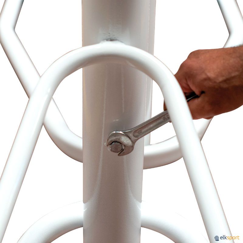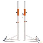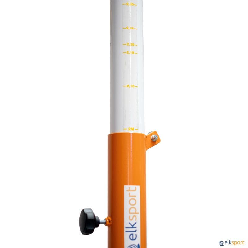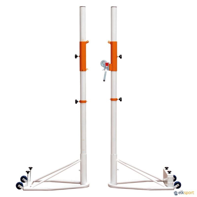 Par de postes com base e rodas, em tubo metálico de secção redonda ø 80 mm. Regulação da altura para vólei, badminton, tênis e pádel mediante mediante sistema deslizante e rosca. Guincho exterior zincado para tensão da rede. Base lastrada com contrapeso fixo de 10 kg e 2 contrapesos removíveis de 30 kg cada, peso total por poste 70 kg. Placa de metal perfurada incluída soldada à base, para fixação ao solo se necessário.