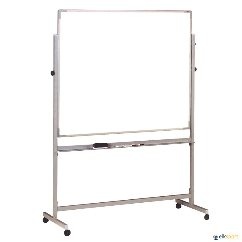Quadro de alumínio, com 2 faces de escrita. Rotação sobre eixo horizontal. Estrutura metálica, com 4 rodas, 2 delas com travão. Suporte de canetas com 150 cm.
