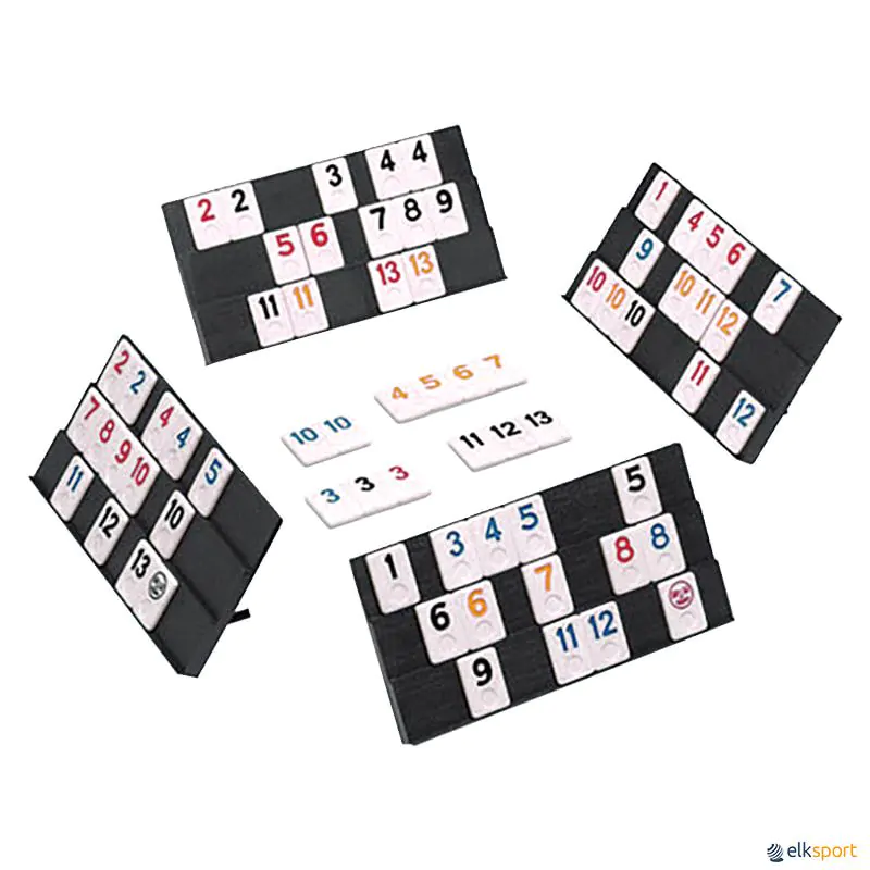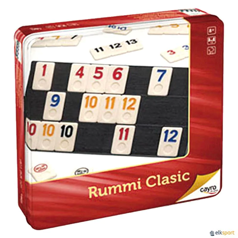 Jogo de RUMMI em elegante caixa de metal: Cada jogador tem de combinar as suas fichas em grupos de 3 ou mais iguais, em séries ou em sequências e somar os pontos obtidos. Ganha quem atingir os 100 pontos em primeiro ou quem ficar sem fichas.