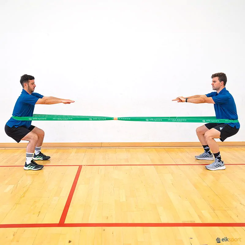 Banda fabricada em fibras elásticas envolvidas em material têxtil. O seu toque é muito agradável e permite uma grande variedade de exercícios de força, aquecimento, reabilitação, etc. Graças ao seu comprimento, é muito útil para trabalhos a pares.