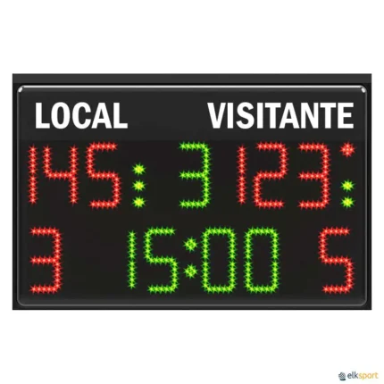 Aprovado pela FIBA nível 3. Tecnologia LED SMT de alta luminosidade dígitos com 20 cm altura, visibilidade a 90 m e ângulo de visão de 150°. A prova de choque da bola de acordo com as normas DIN 18032 e UNI 9554, não requer proteção frontal. Comunicação por rádio. Fácil instalação, inclui suportes para instalá-lo facilmente na parede. A consola de comando permite configurar vários modos de funcionamento de acordo com o desporto escolhido: tempo de jogo e intervalo, conta para a frente ou para trás, indicador de décimas de segundo do o último minuto de jogo, indicador da hora, ... Dimensões: 140 x 73 x 9 cm. Peso: 21 kg.